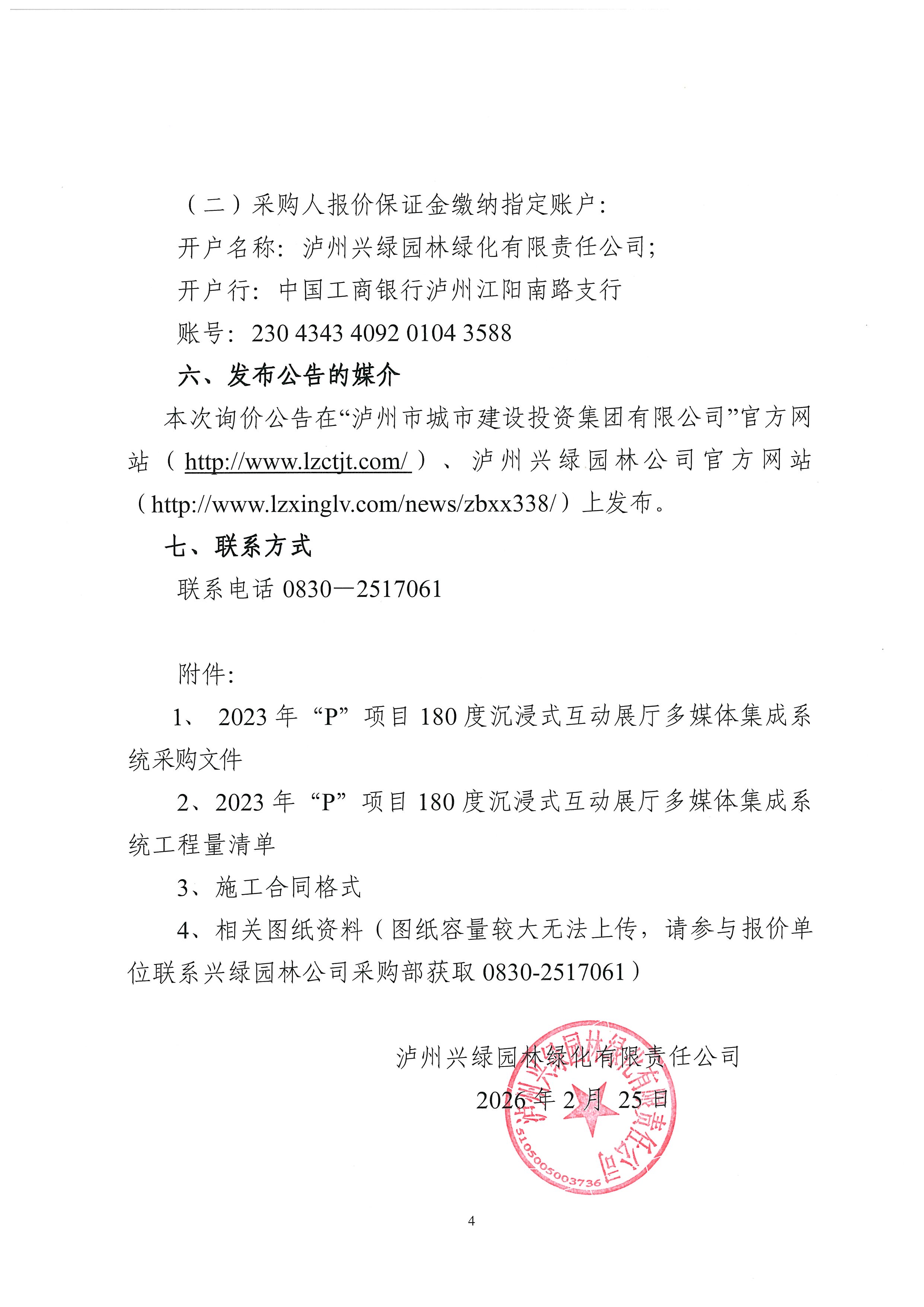 瀘州興綠園林綠化有限責任公司關(guān)于 2023年“P”項目180度沉浸式互動展廳多媒體集成系統(tǒng)項目采購公告